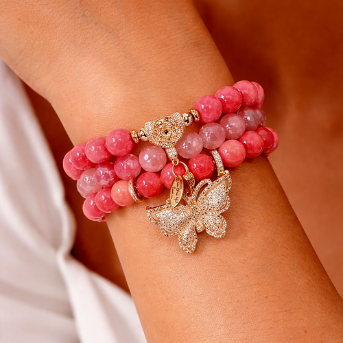 Pink Butterfly Agate & Quartz 3-Piece Stack Bracelet Set